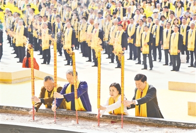 當(dāng)日上午,黃帝故里園區(qū)旗幡獵獵、莊嚴(yán)肅穆。南門廣場(chǎng)上,龍騰虎躍,鼓聲震天。寓意著中華兒女來(lái)自五湖四海的540名炎黃子孫,分別組成各90人的文化方陣、岐黃方陣、企業(yè)方陣、同拜方陣、臺(tái)胞方陣、僑胞方陣六大拜祖隊(duì)伍,整肅衣冠,佩戴黃帝絲巾,進(jìn)尋根門、經(jīng)系祖壇、上軒轅橋、過(guò)故里祠,觀甲骨碑林方柱高舉,感杜嶺方鼎王者風(fēng)范,聽青銅編鐘古音繚繞,最后緩步來(lái)到拜祖廣場(chǎng),端詳兩側(cè)連廊浮雕,感觸中華文明五千多年的源遠(yuǎn)流長(zhǎng)。