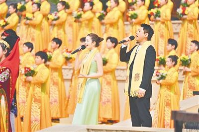 高唱頌歌。來(lái)自香港地區(qū)的鐘鎮(zhèn)濤、臺(tái)灣地區(qū)的朱孝天和澳門地區(qū)的麥嘉欣以及內(nèi)地的曹芙嘉,與56個(gè)民族的少年兒童一起,同歌《黃帝頌》,共聚家國(guó)情。